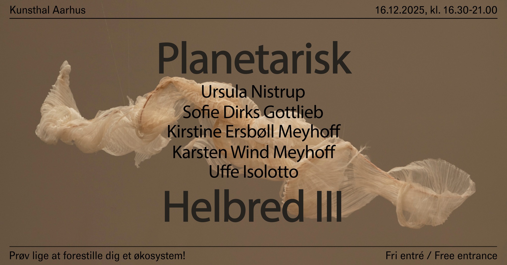 ”Prøv lige at forestille dig et økosystem!” er det tredje arrangement i serien ”Planetarisk Helbred”, hvor Kunsthal Aarhus præsenterer kunstneriske og videnskabelige perspektiver på et af tidens helt store emner: naturens tilstand og dens betydning for os mennesker og alt det liv, vi deler kloden med. Serien er produceret i samarbejdet med forlaget A Mock Book og kurator Jacob Lillemose.