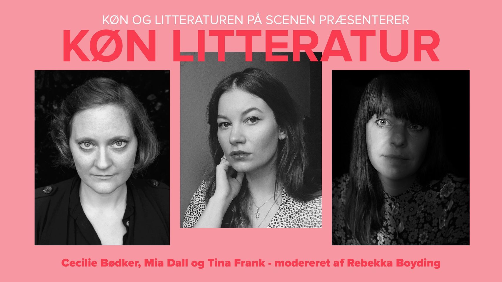 Selvom døre og institutioner har været lukkede, har verden udenfor ikke stået stille. Tværtimod. I løbet af det sidste år er Cecilie Bødker, Mia Dall og Tina Frank alle debuteret med værker, der kredser om det at være kvinde i dag, om sex, angst, frihed, rastløshed, kærlighed og klaustrofobi. Og det kan vi selvfølgelig ikke lade gå vores døre forbi. I et samarbejde mellem KØN og Litteraturen på Scenen vil vi sammen med jer og de tre forfattere – gennem diskussioner og oplæsninger af de helt friske værker – blive klogere på den absolut nyeste KØN litteratur.